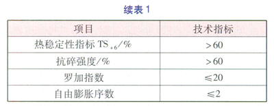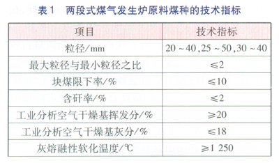 兩段式煤氣發生爐適宜氣化的煤種為不粘煤、弱粘煤、長焰煤等煙煤。雖然相對單段式煤氣發生爐而言,兩段式煤氣發生爐適用煤種范圍較寬,但是對原料煤的指標仍然要求比較嚴格。兩段式煤氣發生爐原料煤種的技術指標見表1。塊煤限下率:塊煤中小于規定粒徑下限部分的質量分數。熱穩定性指標TS+6:量取一定量粒徑為6~13mm的煤樣,在(850±15)℃的馬弗爐內隔絕空氣條件下加熱30min后稱量、篩分,粒徑大于6mm的殘焦質量占各級粒徑殘焦質量之和的百分比??顾閺姸缺碚饕欢降拿簶幼杂陕湎潞罂蛊扑榈哪芰Γ簩⒘綖?0~100mm的塊煤從2m高處自由落到規定厚度的鋼板上,然后將落下的煤中粒徑大于25mm的塊煤再次落下,共落下3次,以破碎后粒徑大于25mm的塊煤占原煤樣的質量分數表示煤的抗碎強度。